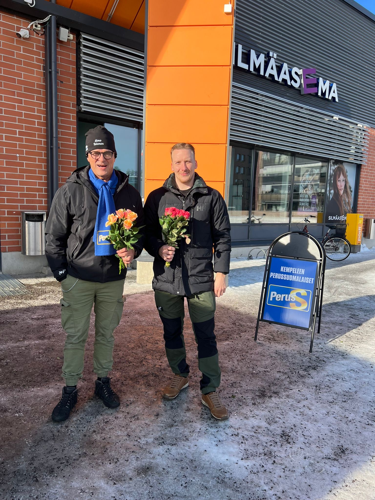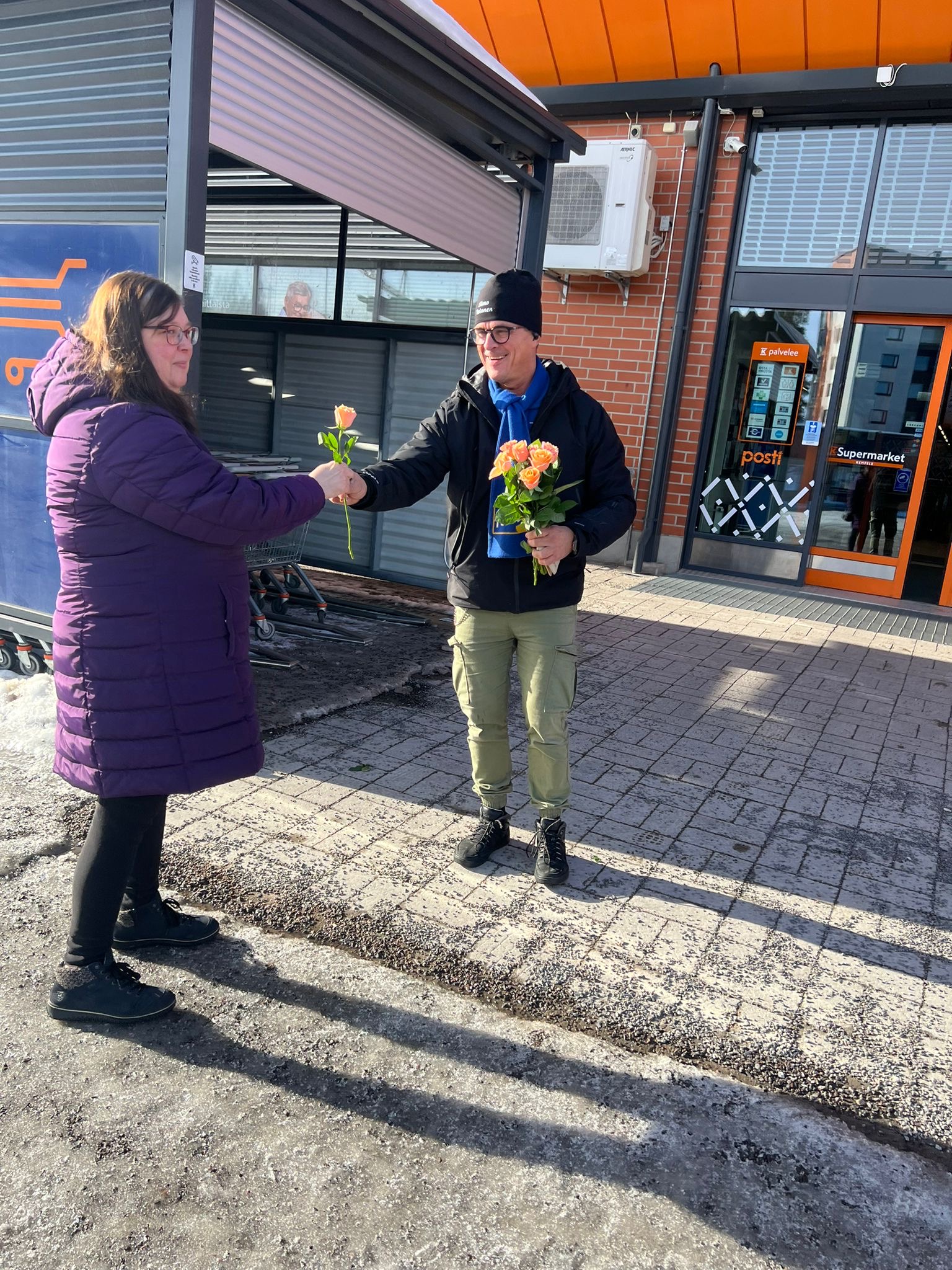 Kempeleen Perussuomalaisten varapuheenjohtaja Janne Kuoppamäki ja kunnanvaltuutettu Simo Tolonen muistivat kyläläisiä kansainvälisen naistenpäivän kunniaksi jakamalla ruusuja K-Supermarketin edessä.